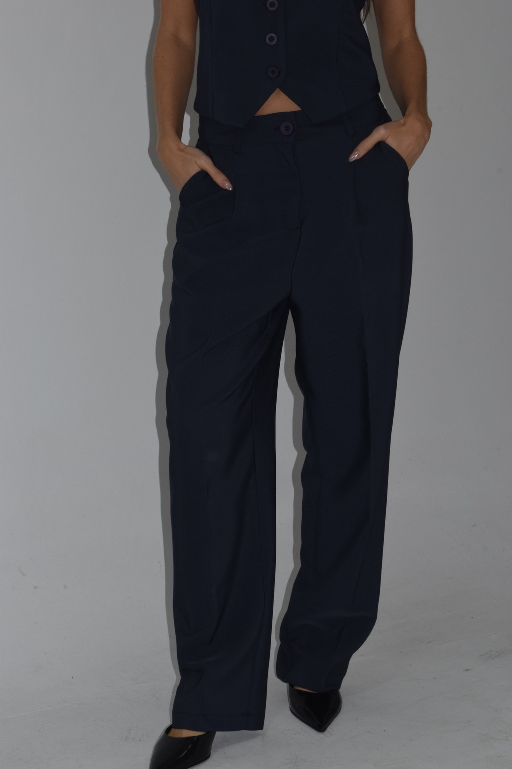 Pantalón sastrero de tiro medio/alto, pinzado al frente con corte recto y pierna ancha. Posee bolsillos laterales y cierre con cremallera metálica con botón. El diseño clásico y la caída fluida lo convierten en un básico versátil para looks formales, de oficina o urbanos.